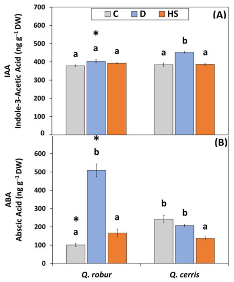 To achieve a more complete understanding of the defense response to water deficit and high temperatures in the studied oak species, it is crucial to examine changes in the key phytohormones indole-3-acetic acid (IAA) and abscisic acid (ABA). They, indeed, play a pivotal role as developmental regulators under optimal growth conditions and in photoprotection of the photosynthetic apparatus under various stress conditions [28].