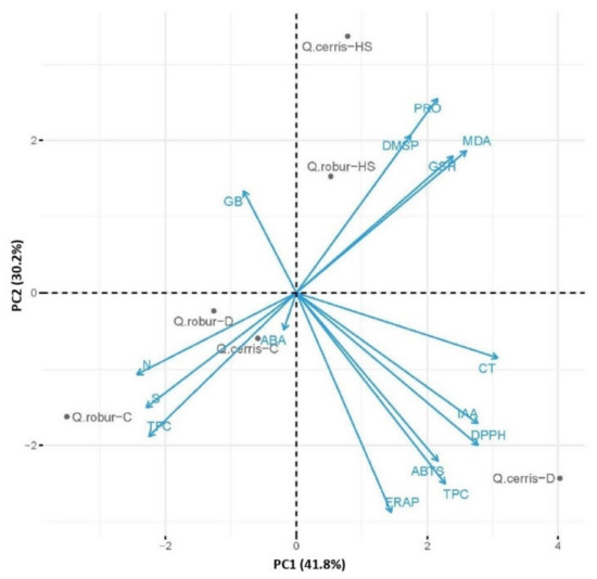 Principal component analysis (PCA) on a correlation matrix including all the biochemical parameters for control I drought-stressed (D) and high-temperatures-stressed (HS) plants of Quercus cerris (Q. cerris) and Quercus robur (Q. robur). TPC: total phenolic content; TFC: total flavonoid content; CT: condensed tannins; MDA: lipid peroxidation measured as levels of malondialdehyde; GSH: total non-thiol compounds measured as reduced glutathione; ABTS: total antioxidant capacity measured by ABTS assay; DPPH: total antioxidant capacity measured by DPPH assay; FRAP: total antioxidant capacity measured by FRAP assay; PRO: free proline; GB: glycine-betaine content; DMSP: dimethylsulphoniopropionate; IAA: free indole-3-acetic acid; ABA: abscisic acid; S: sulfur; N: nitrogen.