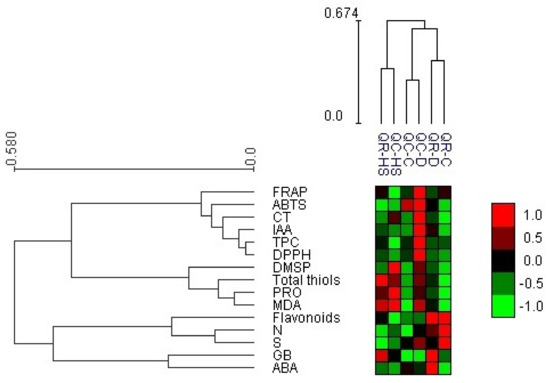 Findings by PCA and heat map cluster analysis almost completely matched the relationships between metabolites suggested by the correlation coefficients (Figure 8). For example, a high significant and positive correlation was found among oxidative stress markers (GSH, MDA) and osmolytes (DMSP and PRO) with correlation coefficients ranging from 0.73 to 0.80. Similar elevated correlation coefficients (i.e., ranging from 0.72 up to 0.95) were significantly found (p < 0.001) among the antioxidant parameters (DPPH, ABTS) and the content of phenolics and tannins.