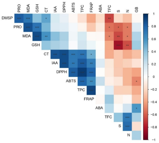 The observed negative correlations among total flavonoid content (TFC) and the amount of both PRO and DMSP is consistent with PCA results (i.e., opposite position of TFC to PRO and DMSP) and with the heat map data. Taken together, the observations further underline that an increase of osmolyte content under high temperatures is associated with a decrease in flavonoid content.