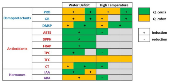 Schematic representation of the soil-water-deficit and high-air-temperatures-induced changes in leaf level content of osmoprotectants, antioxidants, and hormones in Q. cerris and Q. robur. The size of the boxes reflects the relative induction or reduction of one species compared with the other. See legend of Figure 6 for abbreviations of the parameters.