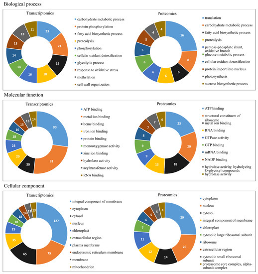 Gene Ontology (GO) annotation classification statistics graph from full-length transcriptome and proteome in the leaves of young oil palm plants under salinity stress; classified accordingly to biological process, cellular component, and molecular function. Only the ten most populated groups per GO term are shown. Numbers represent the amount of positive hits.