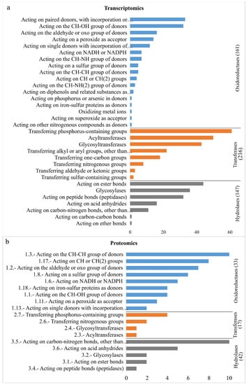 The prevalent chemical reactions by which proteins were classified according to EC were Oxireductases (EC 1), transferases (EC 2), and hydrolases (EC 3) classes (Figure 2b). In the subclasses of oxidoreductases, the main groups were acting on the CH-CH group of donors (EC 1.3), acting on Ch or CH(2) groups of donors (EC 1.17), and acting on the aldehyde or oxo group of donors (EC 1.2). The most representative subclasses of transferases class included those with a transferring phosphorus-containing groups (EC 2.7) and transferring nitrogenous groups (EC 2.6). For hydrolases, those acting on carbon–nitrogen bonds (EC 3.5) and acting on acid anhydrides (EC 3.6) came first.