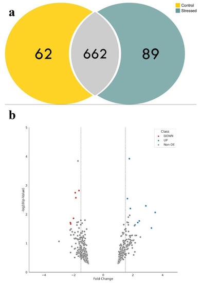 Summary of the proteomics analysis performed on the leaves of young oil palm plants under salinity stress using the PatternLab for Proteomics V software. (a) Control and stressed conditions shared 662 protein identifications; 62 and 89 proteins were uniquely detected in control and stressed samples, respectively; (b) volcano plot of the differentially abundant proteins reported by Pattern Lab’s T Fold module, where 20 proteins showed statistically significant differences in their abundance—proteins in blue were significantly up-regulated while the ones in red were significantly down-regulated between stressed and control samples.