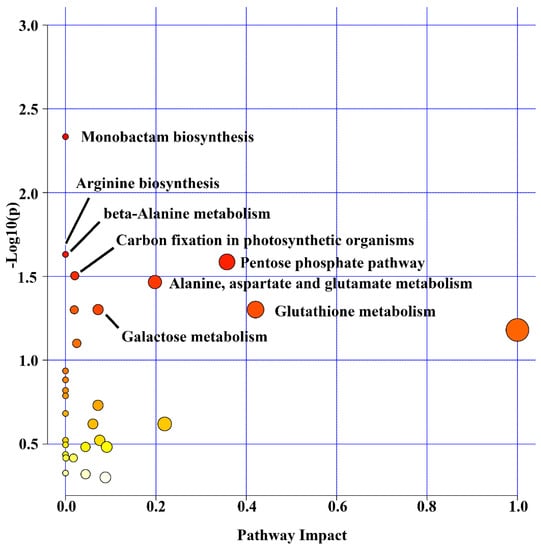 All 129 peaks differentially expressed were then submitted to functional interpretation via analysis in the MS Peaks to Pathway module, and the combined mummichog and GSEA pathway meta-analysis resulted in a list of 19 differentially expressed metabolites (DEMs), which was then submitted to the pathway topology analysis module (Table 4). The monobactam biosynthesis (map00261); arginine biosynthesis (map00220); beta-alanine metabolism (map00410); pentose phosphate pathway (map00030); carbon fixation in photosynthetic organisms (map00710); alanine, aspartate and glutamate metabolism (map00250); galactose metabolism (map00052); and glutathione metabolism (map00480) pathways came out as the one with a raw p ≤ 0.05 (Figure 4).