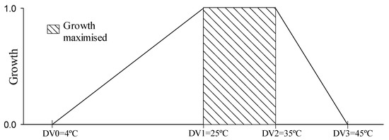 The cold stress temperature threshold (TTCS) and heat stress temperature threshold (TTHS) were determined from the temperature limits being 4 and 45 °C, respectively [13]. The dry stress threshold (SMDS) was determined according to the lower humidity limit, being 0.01, and the dry stress rate (HDS) was adjusted to −0.01 week−1.