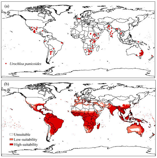 (a) Global distribution of Urochloa panicoides and (b) Ecoclimatic Index (EI) of U. panicoides, modeled using CLIMEX. Unsuitable areas in white (EI = 0), low-suitability areas in light red (0 < EI < 30), and high-suitability areas in red (30 < EI < 100).