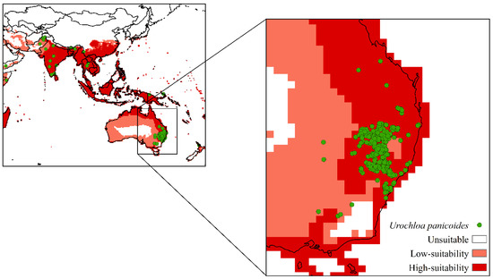 From the results obtained, it is possible to identify places where U. panicoides has high current and/or future climatic suitability and to create management strategies to avoid the entry and spread of the species.