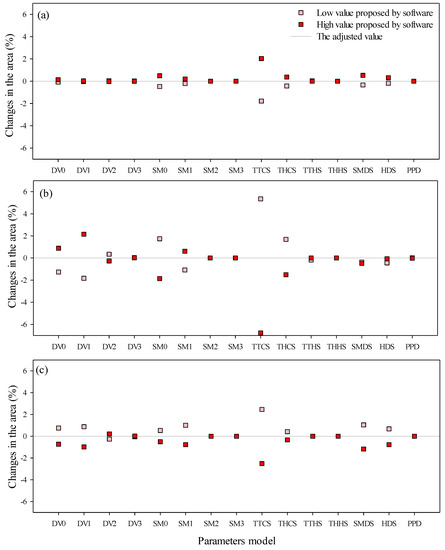 The sensitivity analysis showed that for changes in unsuitable areas, the most sensitive parameters in the model were SM1, SM2, TTCS, THCS, SMDS, and HDS; for low-suitability areas, DV0, DV1, DV2, SM0, SM1, TTCS, THCS, and SMDS; and for high-suitability areas, DV0, DV1, SM0, TTCS, THCS, SMDS, and HDS (Figure 4).