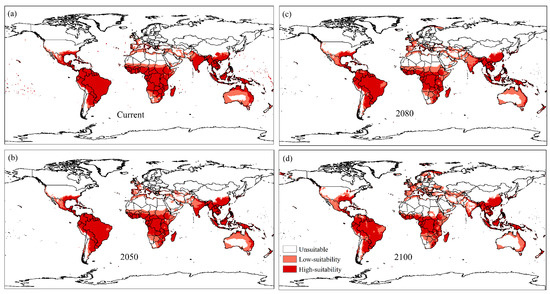 Parameters related to cold stress were found to be sensitive. Sensitivity analyses with lower values of TTCS (3 °C) and THCS (−0.0018 week−1) resulted in a reduction of 1.78% and 0.43% in unsuitable areas, an increase of 5.35% and 1.68% in low-suitability areas, and an increase of 2.46% and 0.42% in high-suitability areas, respectively. Sensitivity analyses with higher values of TTCS (5 °C) and THCS (−0.0022 week−1) caused an increase of 2.03% and 0.34% in unsuitable areas, a reduction of 6.77% and 1.51% in low-suitability areas, and a reduction of 2.51% and 0.34% in high-suitability areas, respectively (Figure 4).