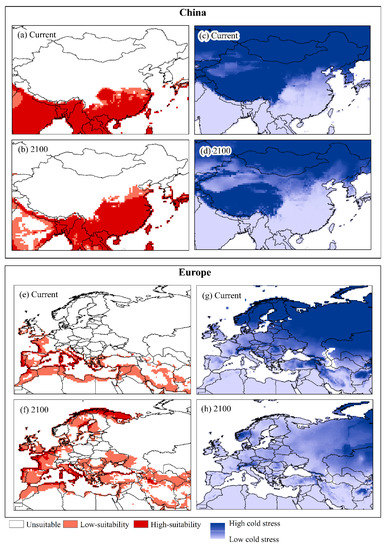 The scenario projected for the year 2100 for China shows an increase mainly in areas highly suitable for establishing U. panicoides (Figure 6a,b). The scenario projected in 2100 for Europe foresees the conversion of unsuitable regions to moderately and highly suitable areas for U. panicoides (Figure 6e,f). In both areas, compared with the current model, the projected scenario for 2100 showed reductions in cold stress (Figure 6b,d,g,h).