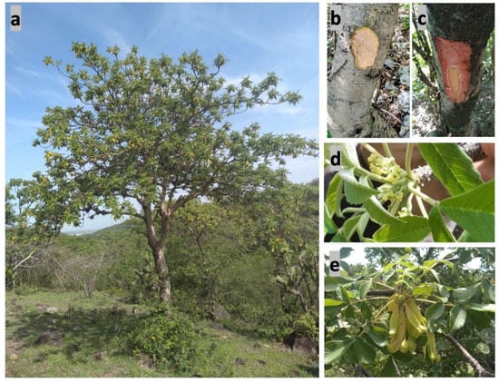 This species grows in warm sub-humid climate with 400 mm rainfall and a mean annual temperature of 24 °C on slopes greater than 30% and parent material of volcanic origin [19]. In the dry season (November–April) the trees lose their leaves, while in the rainy season (May–October) they show abundant foliage [25] (Figure 1 and Figure 2).