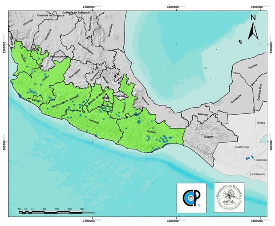 Geographic distribution of A. adstringens. The blue dots indicate locations where samples were collected. The World Information Network on Biodiversity (REMIB, CONABIO), W3Tropicos®-Missouri Botanical Garden Database, National Herbarium of Mexico (MEXU), Herbarium-Hortorio (CHAPA, COLPOS), National School of Biological Sciences (ENCB-IPN), Institute of Ecology, A.C-Xalapa (IE-XAL), Autonomous Metropolitan University (UAMIZ), Luz María Villarreal de Puga Herbarium (IBUG), María Agustina Batalla Herbarium (FCME) and Chapingo Autonomous University Herbarium (CHAP). Qgis version 3.16, OSGeo (Beaverton, USA) software was used. (https://www.qgis.org/es/site/; accessed on 13 June 2022).
