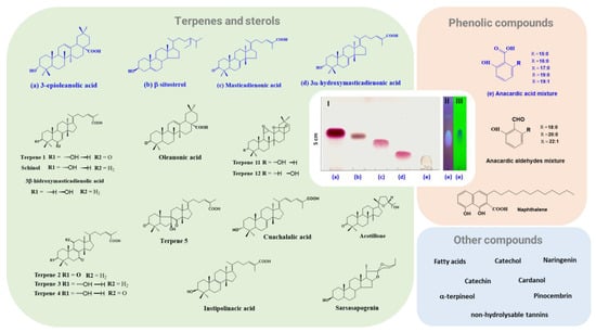 Phytochemicals identified in the stem bark of A. adstringens. The most abundant bioactive compounds in the extracts with organic solvents are indicated in blue. (I) Thin-layer chromatography (TLC) revealed 10% vanillin in sulfuric acid (hexane/ethyl acetate, 7:3). The TLC plate is stimulated with shortwave (II) and longwave (III) ultraviolet light, with which the anacardic acid mixture is visualized (hexane/ethyl acetate, 1:1). In the case of the “other compounds” quadrant, these have only been identified by employing HPLC, GC/MS, or qualitative assays. The chromatoplate was made with compounds isolated and characterized by our research group.