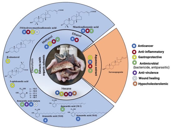 Most of the anticancer studies of the stem bark have focused on the analysis of extracts with organic solvents and their components. In this regard, the cytotoxic activity of the methanolic extract (4–27.5 μg/mL) against various human cancer cells, such as melanoma, colon, and ovarian adenocarcinoma, was identified [5].