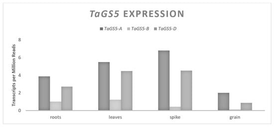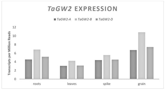 OsGS5 is a gene that codes for a putative serine carboxypeptidase and is associated with changes in GW in rice (Oryza sativa) [61]. An overexpression of OsGS5 in rice is associated with increased expression for five putative G1/S-phase genes involved in cellular mitotic division [61]. It was proposed that increased OsGS5 expression promotes an increased mitotic division of cells through the positive regulation of important cell cycle genes, including the pericarp cells. TaGS5 is orthologous to OsGS5 and natural allelic variation for this gene has been associated with changes in wheat GW [17,18,19]. The TaGS5 homeologues are located on chromosome group 3 [17]. For both the A and D homeologues, there are 10 exons and 9 introns over approximately 3700 bp, coding for a 482 amino acid serine carboxypeptidase. The B copy of TaGS5 has significant structural differences, containing seven exons and six introns over approximately 15,000 bp and coding for an 875 bp amino acid putative serine carboxypeptidase [17,18,19]. An expression analysis showed similar patterns of expression for all the TaGS5 homeologues (Figure 1). Each is abundant in younger developing seed tissue and drops off steadily during grain fill; however, differential expression levels were observed between the homeologues, with little expression from the B genome relative to more consistent expression levels from the A and D genomes [19].
