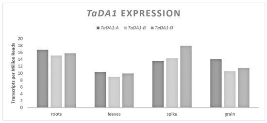 TaDA1 is located on chromosome set two, contains 11 exons spanning approximately 6400 bp and each of the homeologues are predicted to be translated into 504 amino acid proteins [31,32]. The expression of TaDA1 is relatively consistent across all three genomes and across different plant tissues (Figure 3). In Arabidopsis thaliana (L.) Henyh., DA1 has been shown to be a ubiquitin receptor that interacts directly with E3 ubiquitin ligases [33]. There is a large amount of homology between the DA1 gene in wheat and Arabidopsis (approximately 75% at the protein level) and given the established interaction between TaDA1 and TaGW2 in wheat, it is assumed that the function is the same. Transformation experiments have revealed an increase in the pericarp tissue size and number when TaDA1 is downregulated [31]. This suggests that TaDA1 effects the GW by negatively regulating the proliferation of maternal cells, similar to TaGW2. RILs that segregate for allelic variation of TaDA1 and TaGW2 have demonstrated an additive effect on the GW [31]. An exploration of the proteome in independent lines with downregulated TaDA1 and TaGW2 revealed a large amount of overlap for the associated gene expression changes. Changes in the expression of TaDA1 were associated with different levels of 95 separate proteins in vivo and changes in the expression of TaGW2 were associated with different levels of 249 separate proteins, in which 46 proteins were common to both cases [31]. Both TaDA1 and TaGW2 act within their own regulatory pathways, but share some overlap in their function. It is suggested that the magnitude of the effect of TaGW2 on GW would be greater than that of TaDA1 given the larger change to the proteome, which was demonstrated in a single experiment that looked at both genes in the same population [31].