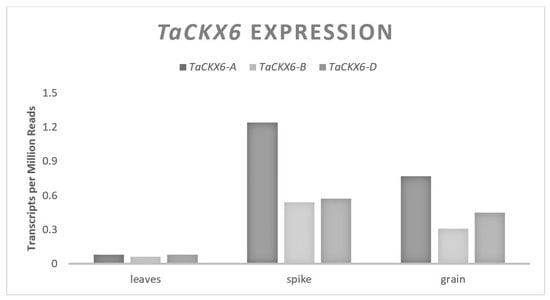 Nulli-tetrasomic lines have been used to reveal the location of TaCKX6 on the chromosome group 3, and natural allelic variation has been discovered on the D genome copy [38,39]. TaCKX6-D has an open reading frame of 1638 bases spanning three exons and is predicted to translate to a 545 amino acid protein [39]. The natural expression of TaCKX6 is found predominantly in reproductive spike tissue and grain with relatively double the expression from the A genome than the B and D (Figure 4). An 18-base pair indel was discovered in the second intron of a modern Chinese cultivar and labeled TaCKX6-D1a. Two years of RIL field experiments found and associated a 7% increase of GW for the line with the indel over the wild type [39] (Table 5). The expression of the wild type allele was between 1.5- and 5-fold higher than the TaCKX6-D1a allele containing the indel, supporting the assertion that TaCKX6-D is a negative regulator of GW [39]. A 29 base indel in the 3′ UTR, directly following the TGA stop codon, is also located on the D genome copy and labeled TaCKX6-D1c [38] (Table 5). TaCKX6-D1c was associated with a 43% increase of GW as compared to the allele lacking the wild type in one year of RIL field experiments [38]. The expression levels were not analyzed in the experiment on the TaCKX6-D1c allele, but the magnitude of the effect suggests that TaCKX6-D has a major influence on GW.