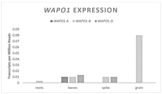 The Wheat Aberrant Panicle Organization 1 (WAPO1) gene codes for an F-Box protein [44]. In wheat, the F-box proteins function as a component of the Skp1–Cullin1–F-box (SCF) complex that recognizes substrates to be ubiquitin tagged for degradation [75]. The SCF complex interacts with E2 ligases which can ubiquitinate substrates for targeted degradation by the proteosome system. This is a separate pathway from GW2, an E3 Ring-type ligase discussed above; however, both pathways result in the ubiquitination of specific substrates for degradation by the proteosome. The specific substrates that the WAPO1 F-box interacts with in wheat are unknown; however, the orthologous gene in rice, (APO1), has been shown to interact with C-class MADS box genes [43]. C-class MADS box genes are transcription factors known to be involved in floral tissue determination [76]. Experiments in hexaploid wheat, where WAPO1 from the A genome was overexpressed, found an increase in the spikelets per spike [45]. It is theorized that WAPO1 positively controls the spikelet number by delaying the termination of the inflorescence growth through the inhibition of floral determination genes. This delay of the termination of inflorescence leads to more branching before spikelet development, resulting in more spikelets. At higher levels of WAPO1 expression, more spikelets were observed; however, the percent of infertile spikelets increased with the expression, such that the plants with the highest expression of WAPO1 were associated with a decrease in yield. WAPO1 contains two exons and one small intron, spanning approximately 1460 base pairs, and is predicted to translate into a 440 amino acid protein [44]. A single copy of WAPO1 exists on each of the three chromosomes from set seven with a relatively even, but low expression across all three genomes (Figure 5). The expression of WAPO1 is found primarily in the inflorescence meristem tissue of the developing wheat head.