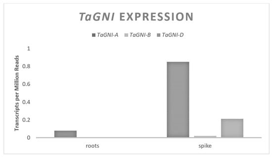 The Grain Number Increase (GNI) gene codes for an HD-Zip transcription factor in wheat [47]. The HD-Zip transcription factor class genes are unique to plants and contain a homeodomain for specific DNA binding and a leucine zipper which acts as a dimerization motif, allowing the protein to bind to specific sites in DNA and assist in transcription activation [78]. RNAi experiments have demonstrated a negative relationship between expression of GNI-A and floret fertility such that it is theorized that GNI promotes floret abortion [47]. GNI was identified from a QTL associated with GN located on the long arm of Chromosome set two. The gene contains three exons spanning approximately 1700 base pairs and is predicted to translate to a 218 amino acid protein. Three homeologues exist in most modern hexaploid wheat with one copy on each of the three genomes. Four wild emmer accessions from Israel possess a second copy of GNI on the A genome [48]. GNI expression is highest in the distal ends of spikelets during development leading up to anthesis. The expression level of GNI from the A and D genomes is confounded, with a recent study reporting the expression from the A genome being two- to five-folds higher than the D genome [47]. This is contradicted by information from the Wheat Expression Browser database, reporting a two- to three-fold higher expression from the D genome relative to the A genome (Figure 6). This could be due to the high sequence similarity (96%) between the A and D genomes in the cDNA, which can perturb the sensitivity of a transcript abundance analysis. Published literature and the data on Wheat Expression Browser agree that there is relatively no expression of GNI from the B genome.