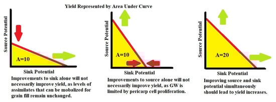 Given that much of the gain in yield since the Green Revolution has come from increasing the GN per unit area [15], stable GW improvement is potentially a more fruitful direction to find the necessary yield improvements required to achieve the goal of doubled production by 2050 [1]. A major area of genetic control over GW comes in promoting more numerous and larger pericarp cells at the time of anthesis [59,60]. This can be thought of as improvements to the sink potential of the plant and there are many genetic pathways in the plant that can be manipulated to enhance the pericarp cell proliferation. Control over the G1/S phase genes can be exploited to promote pericarp cell proliferation [17,18,19,61]. Increasing both the cytokinin and expansin expression in the developing wheat head, leading up to the time of anthesis, also promotes larger and more numerous pericarp cells [37,40,41,42,62,63,69]. Allelic differences in the genes that control the synthesis and degradation of cytokinin and expansin in the wheat head leading up to anthesis can be exploited to promote pericarp cell proliferation. Increasing the cytokinin and expansin levels in the plant leading up to anthesis does more than just improve the sink potential of pericarp tissues, it also enhances the source potential of photosynthetic tissues given the association between increased cytokinin levels in the cell and increased chlorophyl production [34,63]. This may explain why experiments that increase cytokinin or expansin levels in the cell frequently see stable GW improvements without GN decreases. A proportional increase to the source potential, alongside the increase to the sink potential may be essential in stable yield improvements outside of the normal GW/GN trade-off (Figure 7).