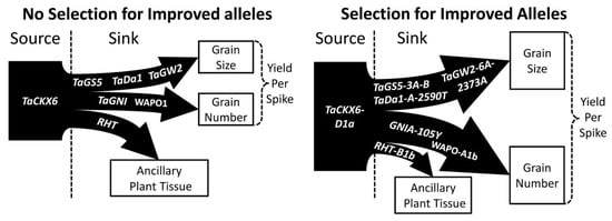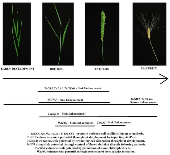 Genotype by environment interaction plays a large role in determining the best method by which to pursue a yield enhancement [12,13,14]. There are a wide variety of growing environments around the world, but they can be aggregated into two distinctly different situations. There are irrigated environments, in which the nutrients and water necessary to grow and maintain the plant are always or more frequently available as opposed to dryland environments, where the resources are limited. Dryland or resource limited environments can, therefore, be thought of as limiting to the source potential of a plant, while irrigated environments are significantly less limited in this regard. Given this understanding, it would be more advantageous to focus on the development of source potential through genetic control when breeding for resource limited environments, and placing more focus on developing the sink potential through genetic control when breeding for irrigated environments. This idea is reinforced by the fact that high WSC lines are associated with more drought tolerance, as the increased abundance in WSC in the plant tissues can be mobilized for grain fill even during periods of reduced photosynthesis under water stress [57,58]. In resource limited environments it would be recommended to breed for lines with high WSC levels in the stem tissues that persist past anthesis into the grain fill. The source potential can be further increased by utilizing awned lines and selecting for a larger flag-leaf area [79,81]. Secondary to the efforts to improve the source potential of the plant at the genetic level, would be control of the size of the pericarp tissue through selection of the proper alleles of TaGS5, TaGW2, TaDA1, TaExpA6, and TaCKX genes (Figure 9); however, in a source limited environment, adjusting the potential of the sink may not result in a stable yield increase [16]. With that in mind, it would also seem appropriate to select for alleles of WAPO1 that promote fewer spikelet formations, such as WAPO-A1a, and alleles of GNI that promote floret abortion, such as the wild type GNI-105N allele, so that in a source limiting environment, fewer sinks are competing for assimilates during the grain fill (Table 8).