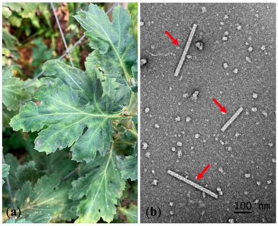 Chrysanthemum leaves exhibiting TMV symptoms and transmission electron micrograph: (a) mosaic symptom (dark green area) on naturally infected chrysanthemum leaves; (b) transmission electron micrograph of TMV rigid rod structure (red arrows) from a symptomatic chrysanthemum leaf.