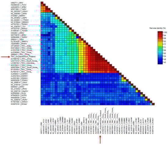 SDT color-coded pairwise identity matrix and phylogenetic tree analysis of TMV CP gene generated from 48 viral sequences comprising 13 TMV sequences and 35 tobamovirus sequences. Color-coded pairwise identity matrix of the Thai chrysanthemum TMV isolate (red arrows). We constructed the pairwise identity matrix using SDT program version 1.2. The cell color indicates the percentage identity score between the two sequences (listed on left and bottom axes) according to the key on the right.