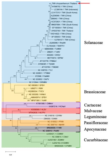 The phylogenetic tree analysis demonstrated that the Thai chrysanthemum TMV belonged to a TMV clade closely related to the TMV isolate from China (GenBank accession no. AY566702.1), while the Egyptian chrysanthemum TMV belonged to a nearby branch (Figure 3). The phylogenetic analyses and the host from which the viruses were originally isolated showed that the currently available 36 tobamoviruses were divided into at least eight subgroups according to their host-plant families: Solanaceae-, Brassicaceae-, Cactaceae-, Apocynaceae-, Cucurbitaceae-, Malvaceae-, Leguminosae-, and Passifloraceae-infecting subgroups. TMV was clustered into a Solanaceae-infecting subgroup (Figure 3).