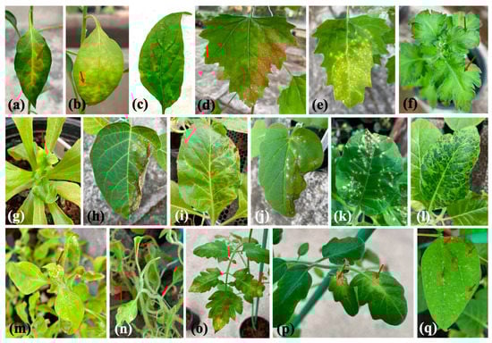 Symptoms exhibited by chrysanthemums and indicator plants (red arrows) mechanically inoculated with TMV: (a–c) Capsicum annum, (d) Chenopodium amaranticolor, (e) C. quinoa, (f) Chrysanthemum x morifolium, (g) Chrysanthemum coronarium, (h) Datura strmonium, (i) Nicotiana benthamiana, (j) N. glutinosa, (k) N. tabacum cv. Samsun NN, (l) N. tabacum cv. Xanthi, (m,n) Petunia x hybrida, (o,p) Solanum lycopersicum, (q) Vigna unguiculata.