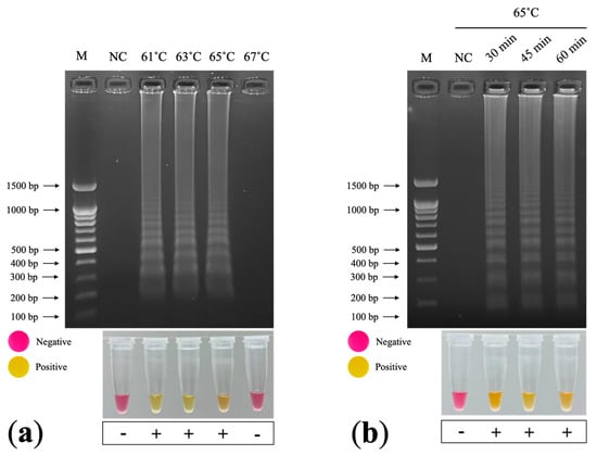 We designed six LAMP primers: FIP, BIP, F3, B3, LF, and LB (Table 3). We prepared the primer stock concentrations as follows: 16 µM of FIP and BIP, 8 µM of F3 and B3, and 4 µM of LF and LB. We detected a ladder-like pattern in the LAMP products after incubation at 61, 63, and 65 °C for 60 min (Figure 5a). However, we did not detect a LAMP product after incubation at 67 °C. Subsequently, we performed incubation for 30, 45, and 60 min at 65 °C (the manufacturer’s recommended temperature) and detected LAMP products for each incubation duration (Figure 5b). A color change from pink to yellow indicated a positive LAMP result, whereas negative results remained pink (Figure 5a,b). The optimal conditions were incubation at 65 °C for 30 min.