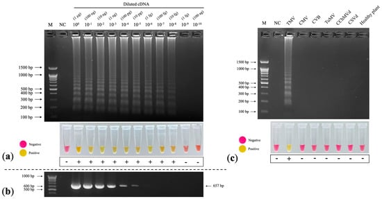 Sensitivity and specificity assays of RT–LAMP TMV detection. (a) Limit of detection (LOD) of RT–LAMP–AGE (top) and colorimetric RT–LAMP (bottom) at 10−8 diluted cDNA. (b) LOD of RT–PCR at 10−5 diluted cDNA. (c) Specificity test of colorimetric RT–LAMP for TMV detection, showing a ladder-like pattern of LAMP products in only the TMV lane. M: 100 bp + 1.5 kb DNA ladder (SibEnzyme, Novosibirsk, Russia); NC: negative control (nuclease-free water).