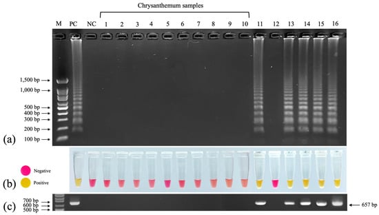 Detection of TMV in plant samples using colorimetric RT–LAMP. Lanes 1–10: chrysanthemum samples from 6 cultivars; lane 11: chrysanthemum inoculated with TMV; lane 12: TMV-inoculated Cassia siamea; lane 13: TMV-inoculated Capsicum annum; lane 14: TMV-inoculated Nicotiana tabacum cv. Xanthi; lane 15: TMV-inoculated Petunia x hybrida; lane 16: TMV-inoculated Solanum lycopersicum. (a) RT–LAMP–AGE. (b) Colorimetric RT–LAMP. (c) RT–PCR with 657 bp amplicons of TMV CP gene. M: 100 bp + 1.5 kb DNA ladder (SibEnzyme, Novosibirsk, Russia); NC: negative control (nuclease-free water).