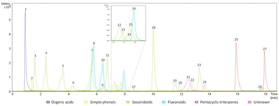 Example of the profile obtained for the extract of one cuspidata sample (316-6-G14) including the chromatograms of the extracted ions of the quantified metabolites. Colors have been used to indicate belonging to the different chemical categories of each numbered peak: organic acids (dark blue), simple phenols (yellow), secoiridoids (green), flavonoids (light blue), pentacyclic triterpenes (red) and unknown compounds (pink).