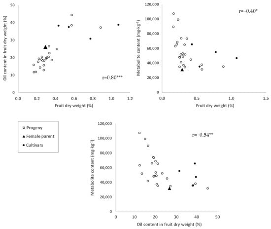 Evaluation of the relationships between fruit weight (g), oil content (%) and total metabolite content (mg·kg−1). *, **, ***: significant at p < 0.05, 0.01, 0.001, respectively.