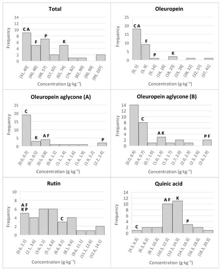 Histograms for total metabolite content and five specific compounds analyzed in the progeny (g·kg−1). The ranges in which the female parent and cultivars fall are indicated with letters as follows: female parent of the open pollination progeny—C; “Arbequina” cultivar—A; “Frantoio” cultivar—F; “Koroneiki” cultivar—K; “Picual” cultivar—P.