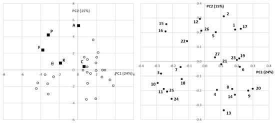 Score (left) and loading (right) plots from PCA. Meaning of letters in the score plot: female parent of the open pollination progeny, C; ”Arbequina” cultivar—A; “Frantoio” cultivar—F; “Koroneiki” cultivar—K; “Picual” cultivar—P. Meaning of numbers in the loading plot: 1—quinic acid; 2—maslinic acid; 3—oleuropein; 4—rutin (B); 5—oleanolic acid; 6—hydroxytyrosol glucoside; 7—verbascoside; 8—elenolic acid glucoside (C); 9—demethyl oleuropein; 10—ligstroside; 11—lucidumoside C (A); 12—acyclodihydroelenolic acid hexoside (B); 13—oleoside/secologanoside (C); 14—demethyl ligstroside; 15—oleuropein aglycone (B); 16—oleuropein aglycone (A); 17—luteolin 7-O-glucoside; 18—unknown 2 (m/z 421); 19—unknown 1 (m/z 363); 20—methoxy oleuropein (A); 21—neonuzhenide; 22—dihydro oleuropein; 23—luteolin glucoside (B); 24—β-hydroxy verbascoside; 25—dehydro nuzhenide; 26—caffeoyl 6-secologanoside; 27—betulinic acid.