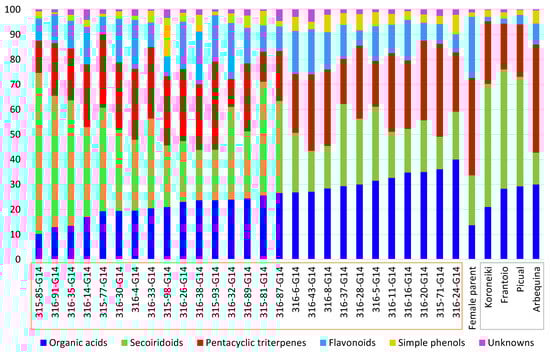 The relative abundance of the different families of compounds in the female parent is not comparable with any of the cultivars. A great content of flavonoids (6.1–22.4%) was observed in the progeny, although none of the evaluated cuspidata genotypes exceeded the percentage of flavonoids found in the female parent (24.4%). Simple phenols and pentacyclic triterpenes ranged from 0.7 to 15.4% and 11.2 to 37.2%, respectively, in the wild olive extracts. Organic acids and secoiridoids showed the highest overall and maximum percentages in the genotypes of the progeny, ranging from 10.2 to 40.0% and 13.0 to 64.5%, respectively. It would be possible to establish a hypothetical correlation between these two families, since, in general, the lower the percentage of quinic acid in a sample, the higher the percentage of secoiridoids found.