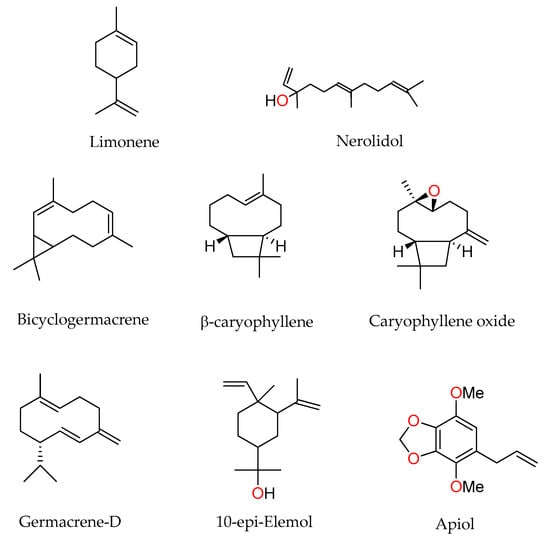 The pure compounds β-pinene, limonene, α-humulene, β-caryophyllene, caryophyllene oxide, and apiol were from Sigma Aldrich (St. Louis, MO, USA).