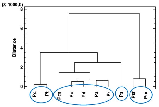 Dendrogram (Farthest Neighbor Method, Squared Euclidean) generated from cluster analysis of GC–MS data of ten Piper species from Peru. P. coruscans (Pc), P. tuberculatum (Pt), P. casapiense (Pcs), P. obliquum (Po), P. dumosum (Pd), P. anonifolium (Pa), P. reticulatum (Pr), P. soledadense (Ps), P. sancti-felicis (Psf), and P. mituense (Pm).