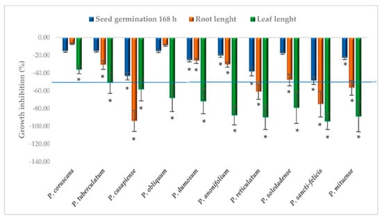 Phytotoxic effects (% inhibition) of the Piper EOs on Lolium perenne, seed germination, and root and leaf growth. Bars represent the average relative values ± standard error (n = 25 plants measured). * Significantly different from the control (p < 0.05), Fisher’s least significant differences test (LSD).