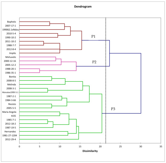 P1 consists of two sub-clusters and is comprised of nine genotypes including ‘Bophelo’, ‘2007-17-1’, ‘199062.1 x Ndou’, ‘2010-5-4’, ‘1990-10-2’, ‘2011-10-2’, ‘1988-7-7’, ‘2012-8-4’, and ‘Impilo’. P2 consists of two sub-clusters with a total of five genotypes, namely ‘Mvuvhelo’, ‘2000-12-16’, ‘2005-12-5’, ‘1988-20-1’, and ‘1986-35-1’. P1 and P2 consisted mainly of genotypes from South Africa except for ‘2012-8-4’, a genotype originating from Mozambique. P3 consisted of 17 genotypes that were sub-divided into 3 sub-clusters. The genotypes grouping within Cluster 3 consisted of a mixture of introduced genotypes (‘Resisto’, ‘Hernandez’, ‘Bonita’, ‘Maria Angola’, and ‘1981-27-1204’), South African (‘2008-8-5’, ‘2008-3-1’, ‘Monate x 1999-5-1 (1)’, ‘1987-2-1’, ‘2005-5-5’, ‘1985-7-1’, and ‘1987-19-5’) and African genotypes (‘Melinda’, ‘K135’, ‘2012-29-4’, and ‘2012-18-2’). Most of the South African genotypes in this group are somehow related to the introduced genotypes.