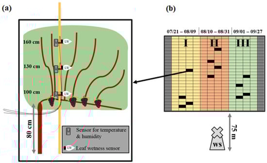 The experiment site was divided into three plots (I, II, and III). The division was made to guarantee pathogen-free conditions for each successive measurement period while leaving the examined plot fungicide-free. A highly infected canopy evinces rolled leaves, necrotic leaves, or a loss of leaves, based on the infection intensity. These infection damages would cause different micro-climatic conditions inside the canopy compared to healthy leaves. Each plot had a size of 4 rows with 25 grapevines per row. In every plot, three randomly chosen grapevines (replicates) were equipped with sensors at heights of 100, 130, and 160 cm. Each height had two sensors attached, each sensor including one temperature (T), a relative humidity (rH) gauge, and one leaf wetness (LW) gauge. The sensors were placed inside the canopy as shown in Figure 1a. A standard field weather station (ws) was located at the vineyard 75 m distant from the experiment site. The instruments of the ws were at a height of 180 cm. Data were collected every 10 min. Measured rainfall was used to indicate experiment extremes.