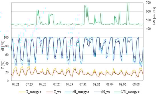 Data from measurement period I (21 July 2021–9 August 2021). T_canopy_ø, average temperature of the canopy; T_ws, temperature of the weather station (°C). rH_canopy_ø, average rel. humidity of the canopy; rH_ws, rel. humidity of the weather station (rH%); LW_canopy_ø, average leaf wetness of the canopy (counts); n = 4.
