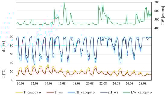 Data from measurement period II (10–31 August 2021). T_canopy_ø, average temperature of the canopy; T_ws, temperature of weather station (°C). rH_canopy_ø, average rel. humidity of the canopy; rH_ws, rel. humidity of the weather station (rH%); LW_canopy_ø, average leaf wetness of the canopy (counts); n = 4.