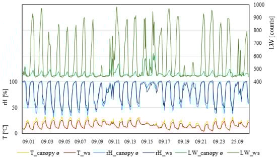 Data from measurement period III (1–27 September 2021). T_canopy_ø, average temperature of the canopy; T_ws, temperature of weather station (°C). rH_canopy_ø, average rel. humidity of the canopy; rH_ws, rel. humidity of the weather station (rH%). LW_canopy_ø, average leaf wetness of the canopy; LW_ws, leaf wetness of the weather station (counts); n = 4.