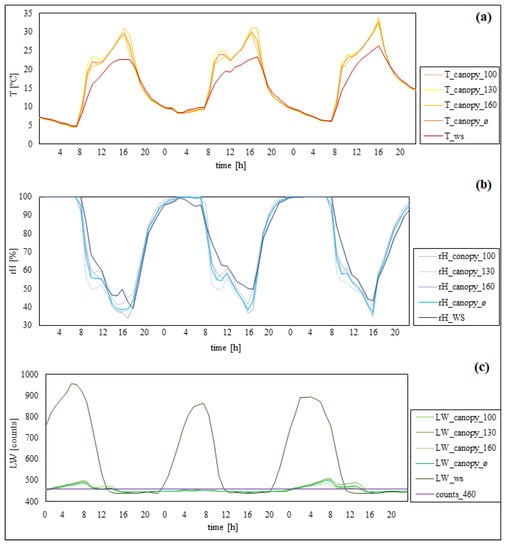 Data (T, rH, and LW) were collected every 10 min from inside the canopy and by the ws. For statistical calculation, hourly data were used. Measurements were individually split every day (by sunrise and sunset) for precise representation of daytime and night results. Values were tested for normal distribution and variance homogeneity and were transformed, if necessary. Values of the different canopy heights (n = 4) were analysed using PROC GLM (9.4 (TS1M6), SAS Institute, Inc., Cary, NC, USA). Differences between means were calculated according to Tukey’s test with 5% probability of error. Measured values of the canopy average and weather station were conducted with a pairwise mean comparison of the PROC TTEST. The boxplots were conducted with Excel (version 2016).
