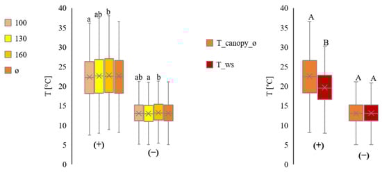 Temperatures during the daytime (+) and at night (−) for each plot. Measurements inside the canopy were shown at canopy heights of 100 cm (T_canopy_100); 130 cm (T_canopy_130); and 160 cm (T_canopy_160); and 100, 130, 160 combined on average (T_canopy_ Ø). Corresponding temperatures measured by the ws (T_ws). All values are in °C. Statistically significant differences inside the canopy are indicated by lower case letters; differences between the canopy average and the weather station are indicated by capital letters, p < 0.05; n = 4.