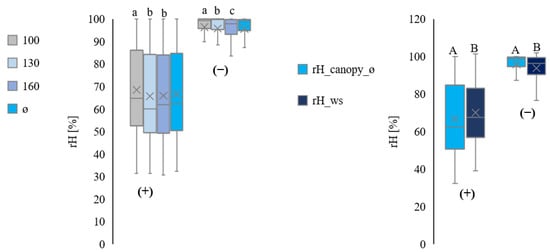 Relative humidity measured during daytime (+) and night (−) for each plot. Measurements inside the canopy are shown at canopy heights of 100 cm (rH_canopy_100), 130 cm (rH_canopy_130), and 160 cm (rH_canopy_160), and 100, 130, 160 combined on average (rH_canopy_Ø). Corresponding relative humidity measured by the ws (rH_ws). All values are in rH%. Statistically significant differences inside the canopy are indicated by lower case letters; differences between the canopy average and the weather station are indicated by capital letters, p < 0.05; n = 4.
