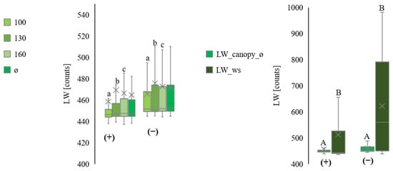 Leaf wetness measured during the daytime (+) and night (−) separated for each plot. Measurements inside the canopy were shown at heights of 100 cm (LW_canopy_100), 130 cm (LW_canopy_130), and 160 cm (LW_canopy_160) and 100, 130, and 160 combined on average (LW_canopy_ Ø). Corresponding leaf wetness measured by the ws (LW_ws). No measures were marked with *. All values are in raw counts. Statistically significant differences inside the canopy are indicated by lower case letters; differences between the canopy average and the weather station are indicated by capital letters, p < 0.05; n = 4.